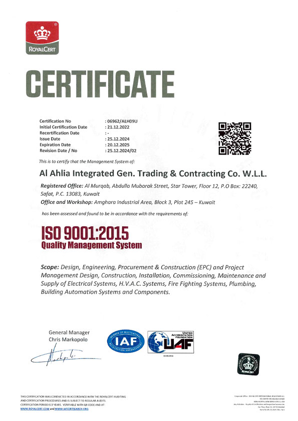 Al Ahlia Integrated General Trading & Contracting Co.W.L.L. has established, implemented, controlled and maintained the process needed to meet the quality in all our operations in every aspects. Al Ahlia vouched to priorities quality, commitment, mutual consultation, professional decisions and benifical relation ships with all the service providers to accomplish our goals and service deliverence without compromising the quality. We raises the flag of sincere ethics in our field to keep our heads always up in our way of success.